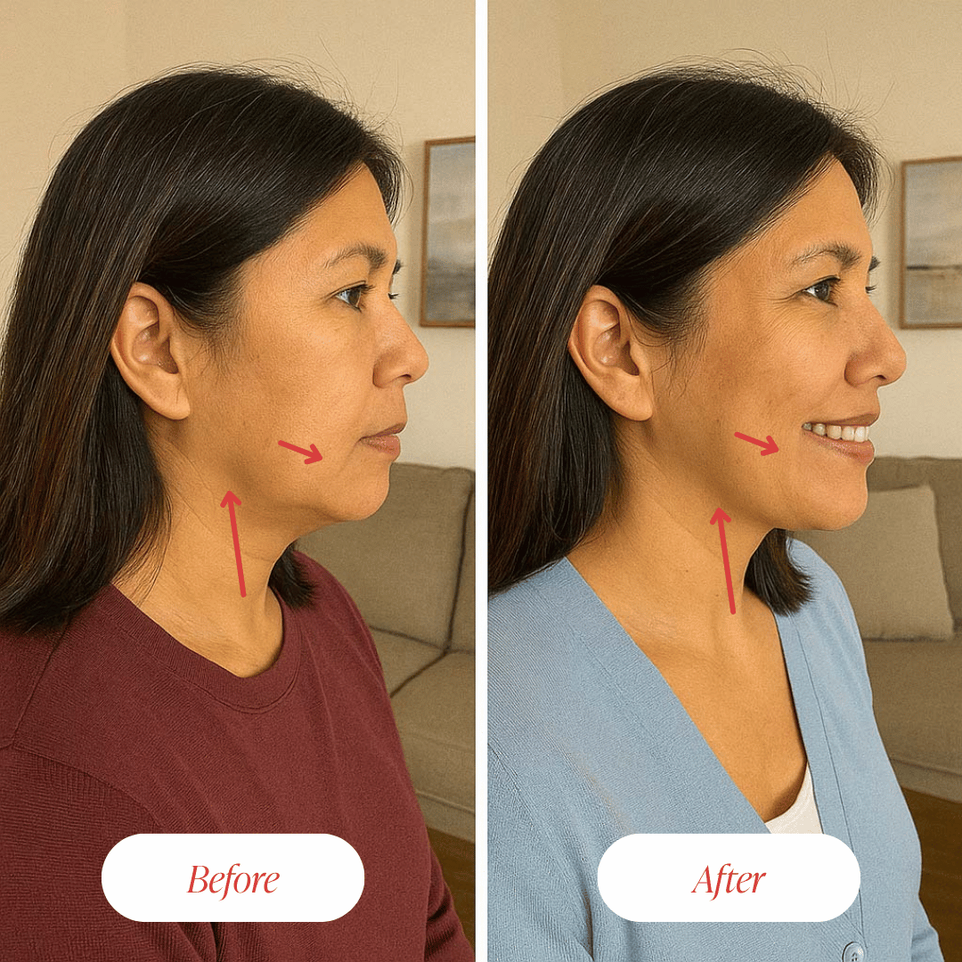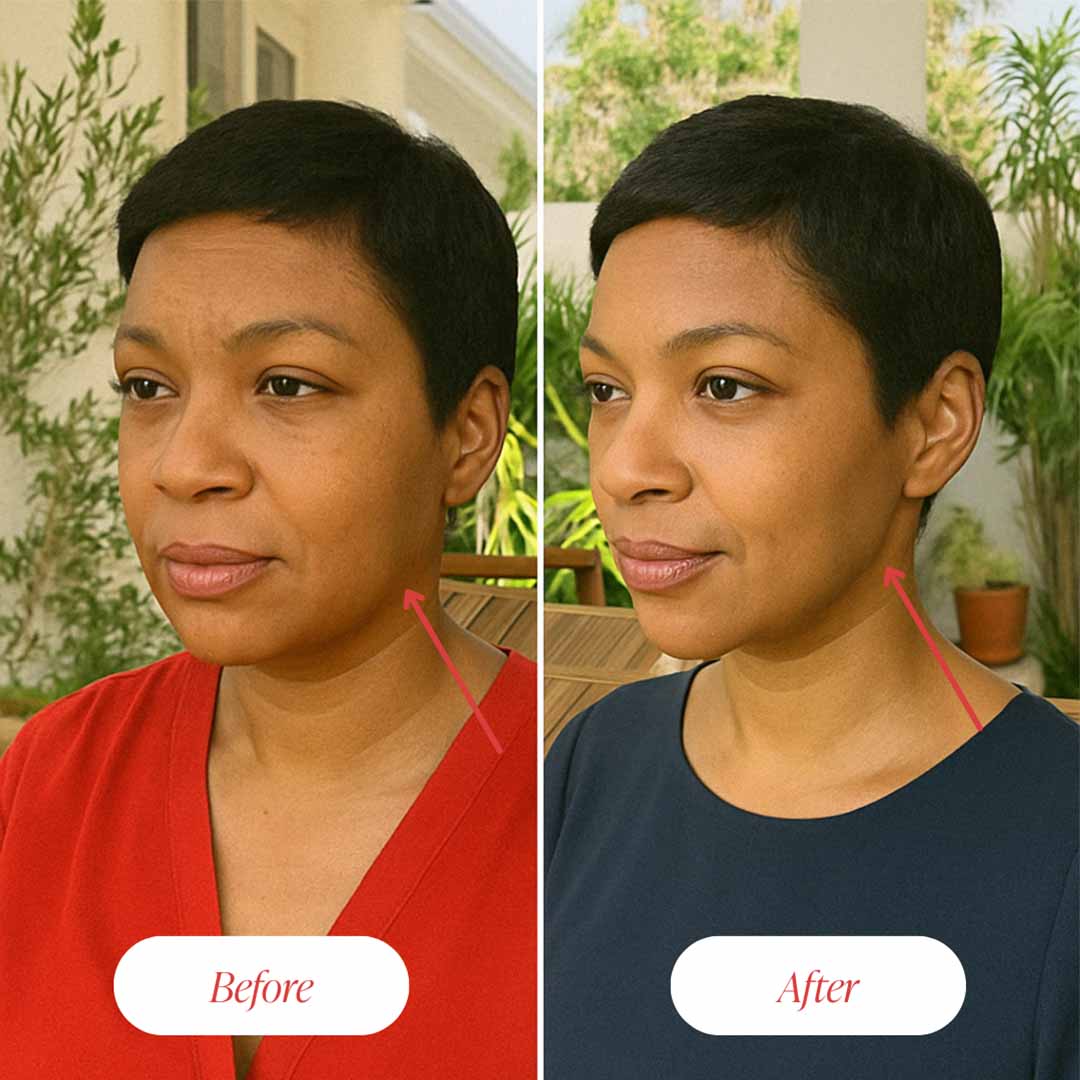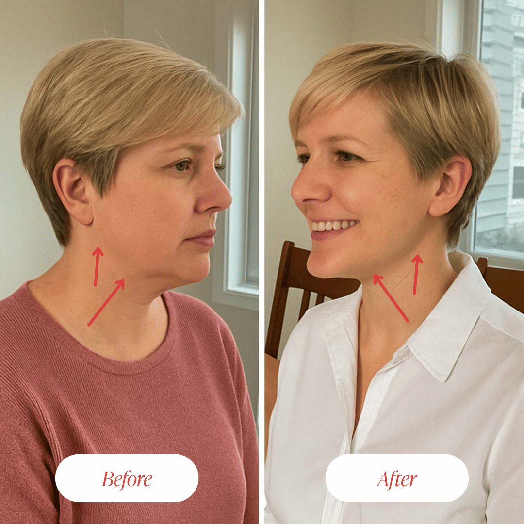 Our strap lifts the soft area under your chin, making it look firmer right away. The gentle upward pressure helps reduce fullness while creating a smoother profile. Wear it regularly to see your chin transform.