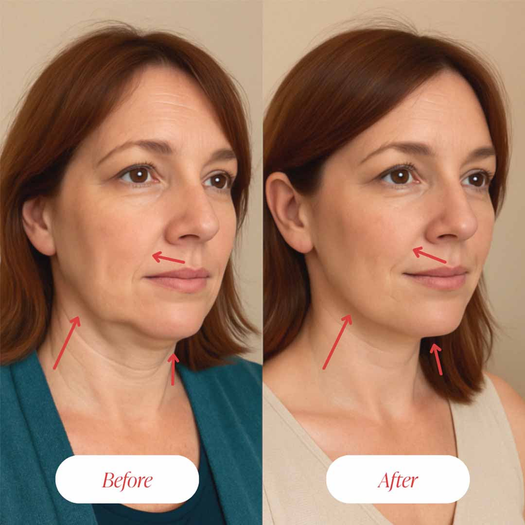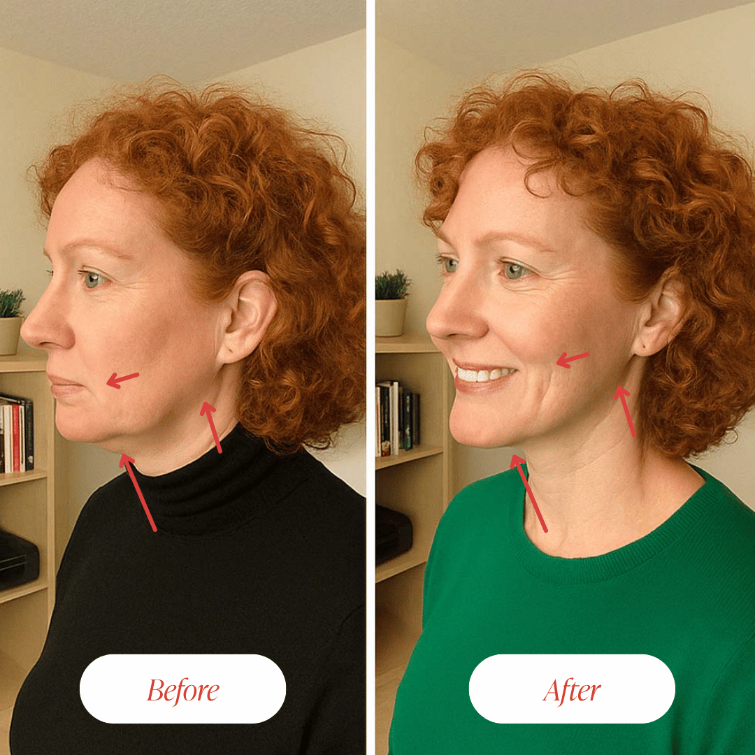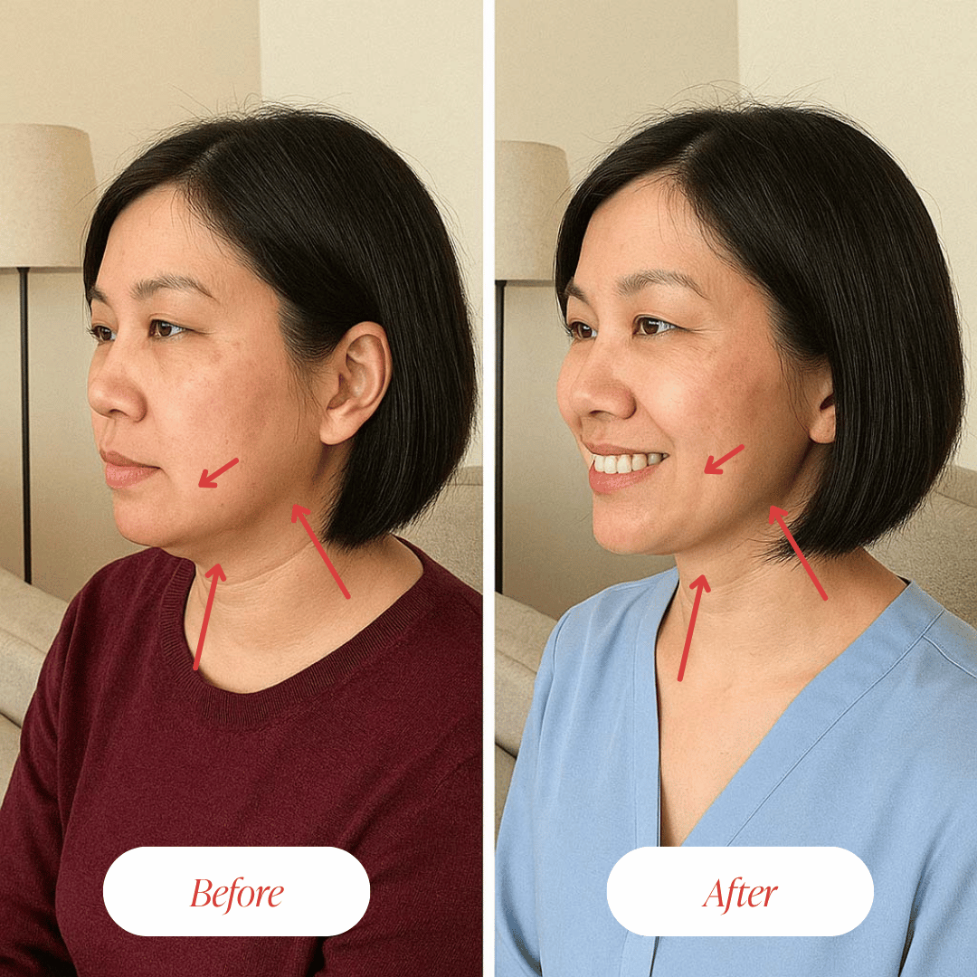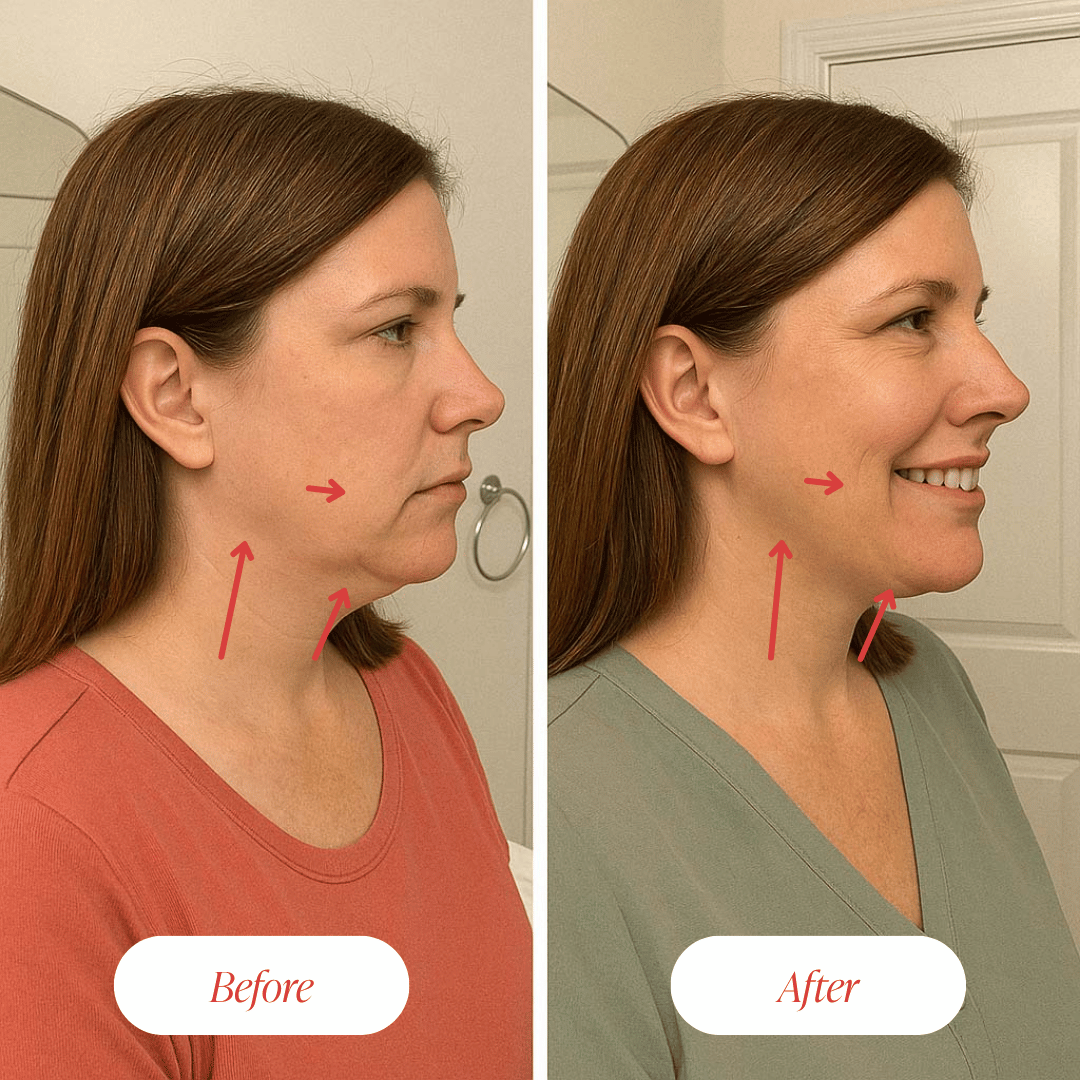 Our strap lifts the soft area under your chin, making it look firmer right away. The gentle upward pressure helps reduce fullness while creating a smoother profile. Wear it regularly to see your chin transform.